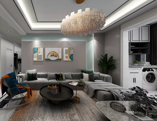 客廳軟裝上的色彩搭配很是nice,最亮眼的還是粉灰色和孔雀藍相間的背景墻,為整個空間增多了一份俏皮的氣息,高級灰的沙發(fā),活力橙的點綴,讓客廳更顯高級質(zhì)感。