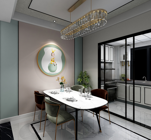餐廳順應柔和的燈光,搭上粉色和藍色的墻面,環(huán)繞柔和韻味,沒有過多的擺設,只有家人一起聚餐時的快樂溫馨。