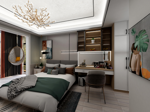 高級灰的墻面,加上綠色的床飾,橙色和灰色相間的窗簾,精美的吊燈、壁畫等裝飾,讓整個空間變得溫文爾雅。