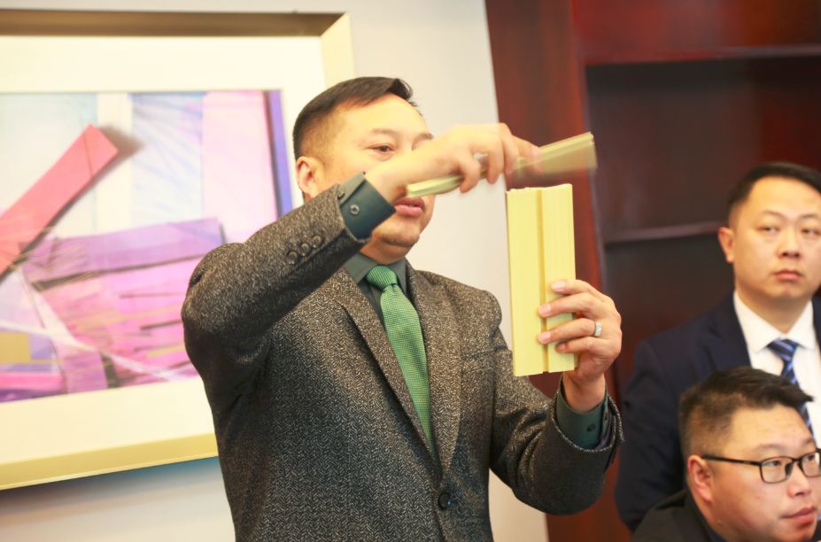 工程部總經(jīng)理潘倫飛現(xiàn)場講解新產(chǎn)品、新線條特點及應(yīng)用。潘總指出,2018年企業(yè)將在產(chǎn)品結(jié)構(gòu)、厚度、硬度、韌性等產(chǎn)品品質(zhì)上全新升級,并同步新增幾十種主材及線條。會上,潘總現(xiàn)場4D演示新品的案例應(yīng)用、配色、軟裝,為進(jìn)一步幫助代理商掌握新產(chǎn)品核心施工要點,更是現(xiàn)場上墻實操。
