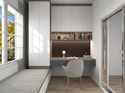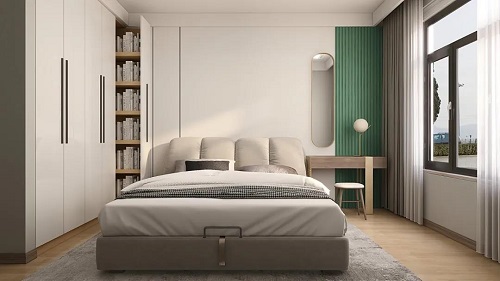 到頂?shù)囊鹿裨O(shè)計,內(nèi)側(cè)設(shè)計成隱藏書柜,滿足業(yè)主睡前閱讀的需求,窗邊的梳妝臺,偶爾可以充當(dāng)書桌,來滿足隨身辦公的需求。