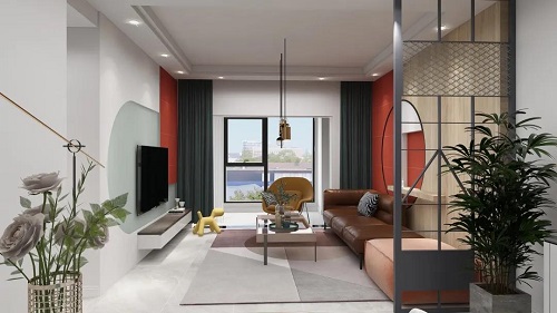皮質(zhì)沙發(fā),搭配拼色的地毯,沙發(fā)背景墻的幾何設(shè)計,呈現(xiàn)出一種高端、有格調(diào)的氣氛。