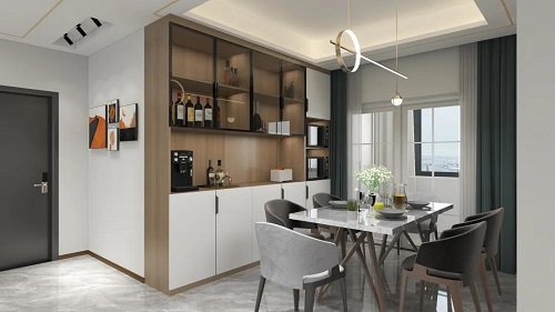 餐廳是家人共享美食時(shí)光的地方,原木系的酒柜,搭配玻璃柜門,顯得格外的精致,藍(lán)灰色餐布,灰色餐椅自帶時(shí)尚,賦予餐廳區(qū)域儀式感。