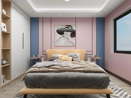 次臥采用藍(lán)灰色+粉色,醞釀著這世間浪漫的語(yǔ)言。